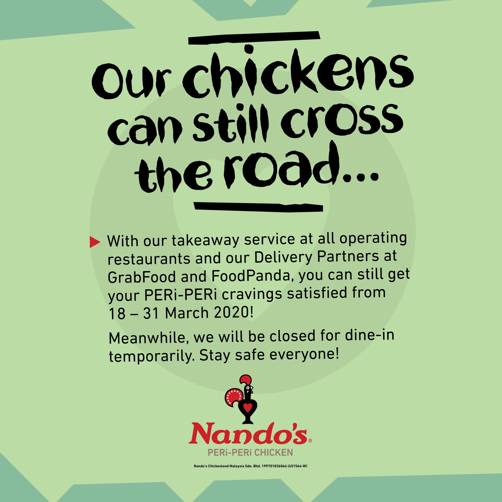 Nando's Chickenland Malaysia Sdn Bhd : Nando's (by nando's uk), take away malaysia (by shivanarrthine), pizzahut sg (by pizza hut singapore), my tesco online (by tesco plc), waktu solat malaysia (by media prima digital sdn bhd).. Contact and general information about nando's chickenland malaysia sdn bhd company, headquarter location in ara damansara, petaling jaya, selangor. Get quick answers from nando's chickenland malaysia staff and past visitors. 0,10 1219 244 0 171247 nando's chickenland malaysia sdn bhd. In conjunction with nando's art initiative 2014 launch, nando's malaysia unveiled the graffiti mural named fighting cockerel by kenji chai that covers the entire façade of the nando's chinatown outlet last nando's chickenland malaysia sdn bhd. 2, jalan kuning, taman pelangi, 80400 džohor baru, džohoras, malaizija.
