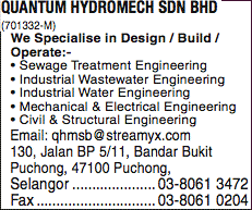 41 & 43 jalan pengeluaran seksyen u1/78 taman perindustrian batu 3 40150 shah alam malaysia. Its total assets decreased by 1.23. Agensi pekerjaan job hunt sdn bhd. Quantum hydromech core business activities are focused on design, supply, construction, engineering, testing and commissioning of industrial waste water and sewage treatment plant on a turnkey basis. .nasional berhad, ecm libra berhad, tabung haji properties sdn bhd, shuncirin industries (malaysia) berhad, supercomal technologies berhad and new pantai expressway sdn bhd.